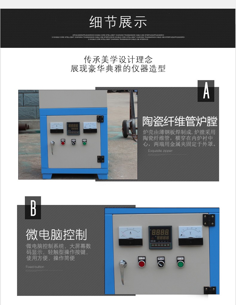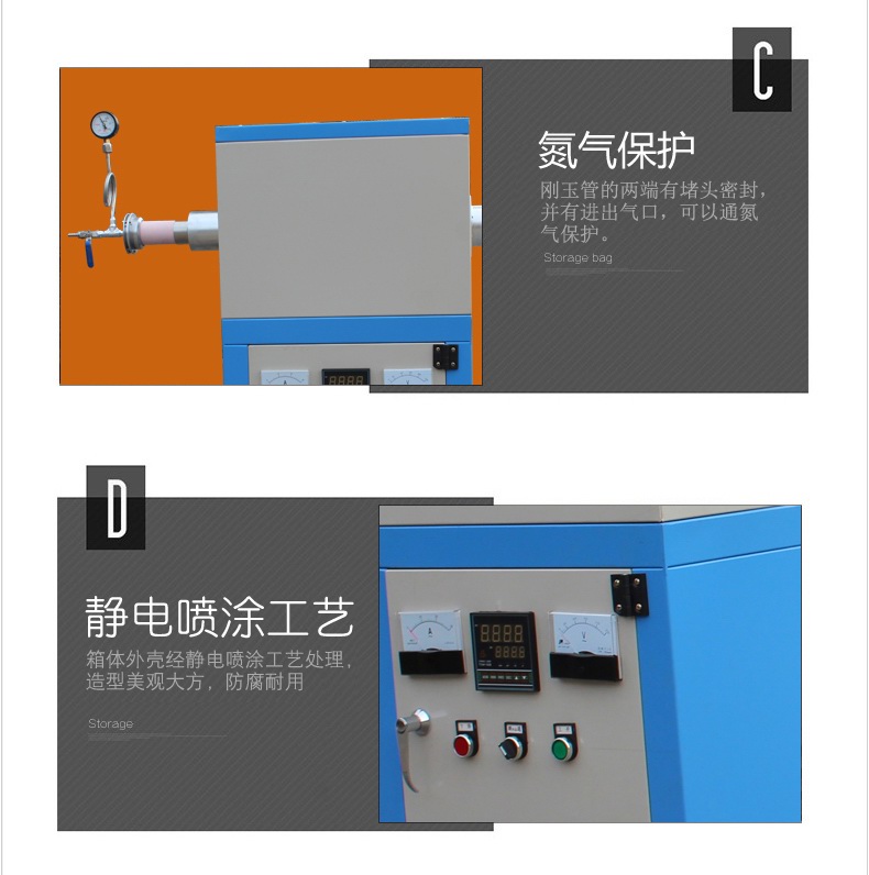 1.外殼采用鋼板這邊焊接而成,外表靜電噴涂,美觀大方。爐膛采用氧化鋁陶瓷纖維材料制成,加熱元件為硅鉬棒。工作室為優質高密度剛玉管,剛玉管的兩端配有法蘭裝置,可以對爐膛內部抽真空。也可以通入氣氛保護。